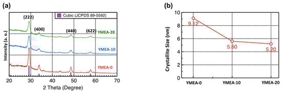 where D represents the crystallite size, λ represents the wavelength, i.e., 0.154 nm, of the Cu Kα radiation, β is the full width at half maximum of the main peak, and θ is the peak position. The calculated crystallite sizes corresponding to the (222) plane were 9.12 (YMEA-0), 5.60 (YMEA-10), and 5.20 nm (YMEA-20). Nucleation and grain growth are the main mechanisms involved in the crystallization process. When the film thickness is small, the surface energy suppresses the grain growth []. Therefore, under the same 500 °C annealing conditions, YMEA-20 was more difficult to crystallize than YMEA-0 and YMEA-10. In addition, the main peaks did not shift as a function of the MEA content, indicating that the interlayer distance (d) remained the same, regardless of changes in the MEA content.