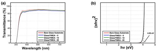The optical characteristics of the glass/Y2O3 films are displayed in Figure 4. The transmittance spectra of the Y2O3 films and bare glass substrates, encompassing the visible-light spectrum in the range of 380–780 nm, are displayed in Figure 4a. The glass/Y2O3 films demonstrated an average transmittance exceeding 80% in the visible-light range, comparable to that of the glass substrate. The films exhibited similar transparency regardless of the MEA concentration. The optical bandgaps of the Y2O3 films were estimated from the slopes of the linear regions in the (αhν)2 versus hν graphs. Figure 4b displays these plots derived from the Tauc equation.