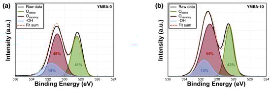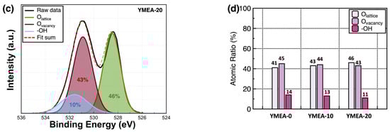 Figure 5 depicts the chemical compositions of the films obtained via XPS. The XPS peaks were fitted using a Gaussian distribution. This analysis method was employed to accurately determine the chemical compositions of the films. Charges were corrected using the C1s peak at 285.0 eV. Figure 5a–d show the O1s core-level spectra. The O1s peak consists of three components corresponding to the oxygen lattice (OL), oxygen vacancies (OV), and hydroxyl groups (–OH), with binding energies of 528.5, 530.9, and 531.6 eV, respectively. The proportion of hydroxyl groups decreased from 13.6% (YMEA-0) to 13.5% (YMEA-10) and then to 10.7% (YMEA-20). Furthermore, the films with added stabilizers exhibited lower OV contents than the reference, decreasing from 44.5% (YMEA-0) to 44.4% (YMEA-10) and subsequently to 43.5% (YMEA-20). In contrast, the oxygen lattice component increased from 41.0% (YMEA-0) to 42.0% (YMEA-10) and subsequently to 46.0% (YMEA-20). The proportions of the three O peaks in the O 1 s spectra of the Y2O3 films as a function of MEA content are listed in Table 1. The metal–oxygen bond weakened and the number of point defects related to the oxygen vacancies increased. A certain amount of added MEA can substitute O with N in the films, decreasing the oxygen vacancy concentration [].