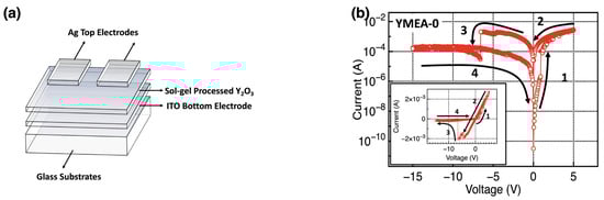For preparing active channel layers, several metal oxides, such as ZrO2, TiO2, HfXO, and Y2O3, have been investigated [,,,,,]. These metal oxides are thermally and chemically stable with respect to organic channel layers. Moreover, these metal oxides do not encounter the alignment issue and are compatible with the complementary metal oxide semiconductor process, unlike nanowires, carbon nanotubes, graphene, or two-dimensional materials. Each of these metal oxides has advantages, and among them, Y2O3 exhibits promising properties. Y2O3 is an insulator with high k-values and a large optical bandgap. Therefore, Y2O3 may replace the low-k SiO2 insulator used in the semiconductor fabrication industry [,]. Recently, based on these advantages, GaN- and SiC-based power semiconductor devices have incorporated Y2O3 [,,]. In addition, the high thermal and chemical stabilities and fast ion movement of Y2O3 render this metal oxide suitable for use in active channel layers in RRAM devices [,,]. Finally, the presence of a sneak path leakage current arises as a problem when attempting to realize RRAM arrays with unit RRAM devices. To solve this problem, a transistor is connected to the RRAM devices, forming a 1T-1R structure [,]. Post-deposited Y2O3 layers present on metal-oxide thin-film transistors (TFTs) boost the bias stability of TFTs. When Y2O3 layers are simultaneously used as active channel layers of RRAMs and passivation layers of metal-oxide TFTs, the fabrication time and cost of the IT-IR structure can be drastically reduced [,].