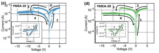 (a) Schematic image of the fabricated Y2O3 RRAM devices. (b–d) Representative I–V curves of the Y2O3 RRAM devices as a function of MEA content. The arrows and numbers indicate the voltage sweep directions.