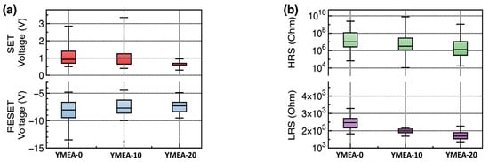 The performance parameters of the RRAM devices are extracted and plotted, as shown in Figure 7. The SET voltage values of YMEA-20 were slightly lower and more uniform than those of the other devices. The electric field required for the SET process can be calculated using the following equation: