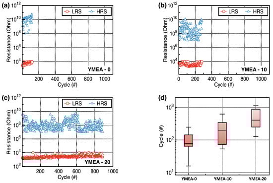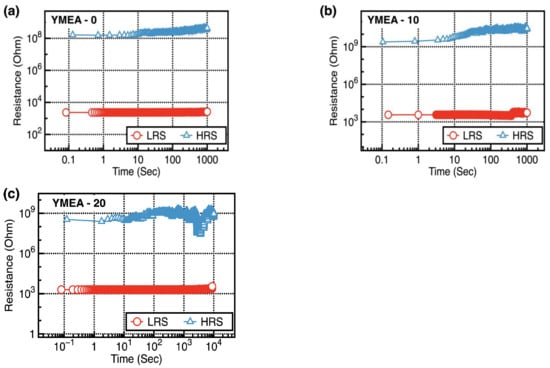 The nonvolatile memory characteristics of the fabricated RRAM devices were estimated by obtaining endurance and retention data. Figure 8a–c display the representative endurance characteristics of the fabricated Y2O3 RRAM devices. Figure 8d displays statistical data showing the maximum endurance cycles as a function of MEA content. During endurance tests, the LRS and HRS were measured at Vread = +0.1 V after programming (+5.0 V for 500 ms) and erasing (−15.0 V for 500 ms). The RRAM devices consisting of the Y2O3 films (YMEA-20) demonstrated superior endurance properties. In addition, the YMEA-20 devices exhibit stable retention properties up to 104 s without significant changes in the LRS and HRS values, as shown in Figure 9. Excess formation of the conductive filament made triggering the SET and RESET operations increasingly challenging. Relatively high oxygen vacancy concentrations in the YMEA-0 and YMEA-10 films formed excess conductive filaments, which complicated the change of status during the endurance tests.