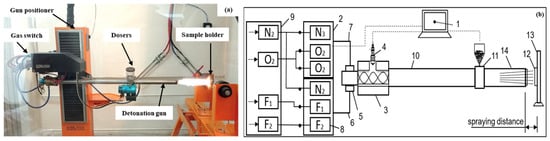 General view of the CCDS200 installation (a) and its process diagram (b): 1—control computer, 2—gas distributor, 3—mixing-ignition chamber, 4—spark plug, 5—barrel valve, 6—fuel line, 7—oxygen line, 8—gas valves, 9—gas supply unit, 10—breech of the barrel, 11—powder feeder (doser), 12—workpiece; 13—manipulator, 14—muzzle of the barrel.
