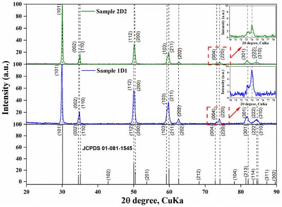 However, due to similar lattice parameters, distinguishing between tetragonal and cubic zirconia structures can be difficult. As noted by Srinivasan et al. [24], the tetragonal structure can be distinguished from the cubic structure by the characteristic splitting of the Bragg peaks of the tetragonal phase, including pairs of peaks (002) and (200), (113) and (311), (004) and (400), and (006) and (600). These were observed in the 2θ regions of 72–76° and 120–132°. In contrast, the cubic phase had single peaks at all these positions. As can be seen in Figure 2, characteristic splitting of the Bragg peaks of the tetragonal phase was observed in the X-ray diffraction patterns of samples 1D1 and 2D2, indicating its predominance in the crystal structure of the sprayed YSZ top layers. Also, as shown in Figure 3, there were slight differences in the phase intensity of the samples. In particular, the phase reflections of the tetragonal phase in sample 1D1 had a higher intensity compared to sample 2D2. The weaker intensity of the diffraction maxima in sample 2D2 could be related to its higher porosity [25].