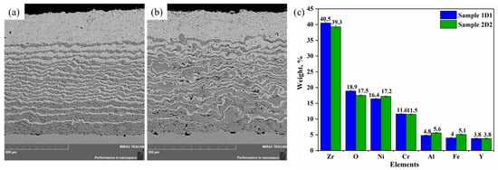 Cross-sectional BSE images of samples 1D1 (a) and 2D2 (b) with visible layered structure, as well as a histogram of the distribution of elements (Zr, O, Ni, Cr, Al, Fe, and Y) by their content in percentage (c).