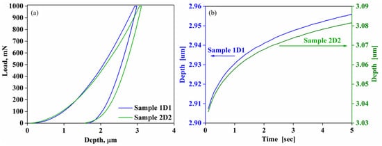For creep analysis, the maximum load was kept constant for 5 s. Figure 4b shows the variation of the indenter penetration depth over time at constant load. It can be seen that the penetration depth of the indenter tip continued to increase when the load was held constant until the constant load ceased. This increase in penetration depth under constant load conditions is indicative of material creep.
