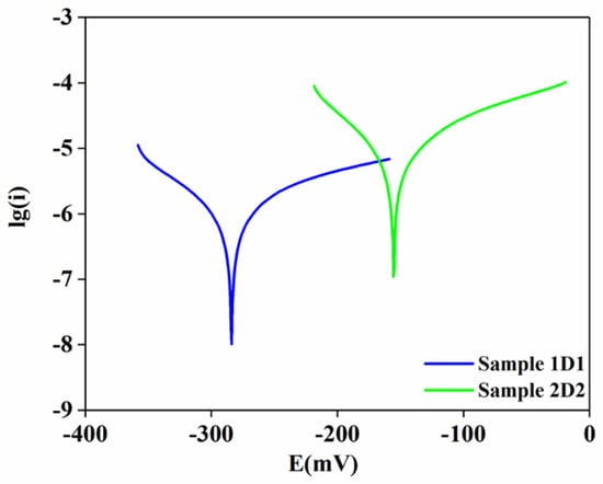 Potentiodynamic polarization curves of samples 1D1 and 2D2 in a 3.5% NaCl solution recorded for 30 min at room temperature.