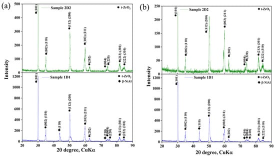 In 1D1 samples cooled in air, the tetragonal ZrO2 (t-ZrO2) phase predominated, accounting for 98.2% of the total coating volume, while the presence of β-NiAl was insignificant and amounted to only 1.8%. This indicates the stability of the main phase under these cooling conditions, while β-NiAl had minimal effect on the coating structure. For vacuum-cooled 1D1 samples, an increase in the fraction of β-NiAl to 7.5% and a decrease in the fraction of t’-ZrO2 to 92.5% were observed. These changes in the phase composition indicate the influence of the cooling environment on the thermal behavior of the coating. The air-cooled 2D2 samples were entirely composed of t-ZrO2, indicating the retention of this phase during faster cooling. In 2D2 samples cooled in vacuum, the entire top layer was represented by t’-ZrO2, confirming the phase transformation under uniform cooling conditions.
