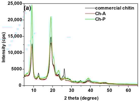 In the case of commercial chitin, the primary peak occurs at 2θ = 19.2. This is a diffraction peak corresponding to the N-glucosamine in the chain, while the secondary peak at 2θ = 9.1 is smaller and is due to the presence of N-acetyl-D-glucosamine []. The existence of these peaks indicates the crystalline structure of chitin, which can occur in three forms: α, β or γ []. Additional peaks at 2θ angles of 26.2 and 38.9 are characteristic of silica. The similarity of the spectra of chitin samples (Ch-A and Ch-P) to the XRD spectrum of commercial chitin testifies to the efficiency of chitin synthesis based on these waste materials. In the case of Ch-A and Ch-P, there are two characteristic diffraction peaks in the spectrum with the highest intensities at 2θ angles of 9.1 and 19.1. These results agree with those obtained by Waśko et al. [], who characterized chitin obtained from the puparium of H. illucens and determined its α form of crystallinity. Other peaks with low intensities at 2θ angles 26.2, 34.6 and 38.9 are characteristic of silica.