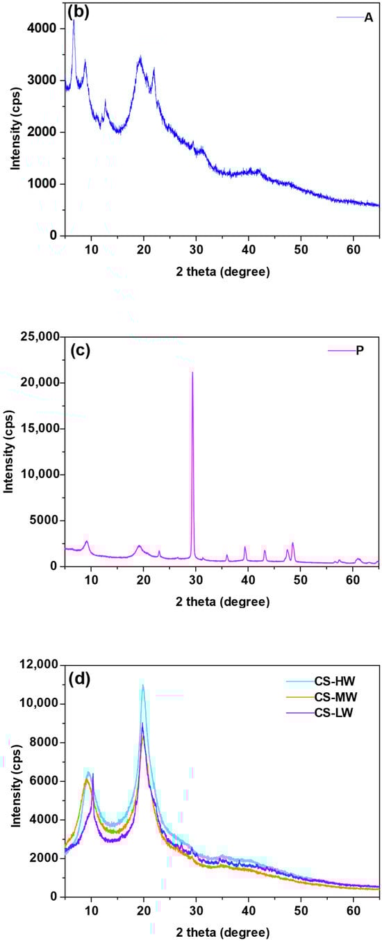 In the case of the spectrum of the sample derived from grinding the adults (A), a number of peaks appear, and two of them at 2θ angles 22.0 and 31.9 are matched by calcium and aluminum silicate. This spectrum shows a raised background, indicating the presence of amorphous substances in this sample. As for the spectrum of the sample attained by grinding H. illucens fly puparia (P), peaks matching calcium carbonate were obtained at the following 2θ angles: 23.0, 29.3, 35.9, 39.4, 43.3, 47.5 and 48.5. For all the chitosan samples (CS-HW, CS-MW, CS-LW), two characteristic broad peaks are observed in the X-ray diffraction spectrum. The primary peak of chitosan corresponds to -NH2 groups in amine II and occurs at 2θ equal to 19.9. At 2θ equal to 9.4 there is a secondary peak. This is a less intense diffraction peak, which is related to the existence of -N-CO-CH3 groups in amine I contained in the structure of chitosan [].