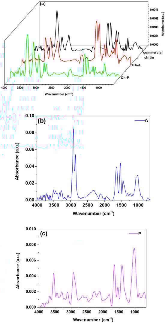 ATR-FTIR method of (a) commercial chitin, chitin obtained from H. illucens adults (Ch-A), chitin derived from H. illucens puparia (Ch-P), (b) the ground form of H. illucens adults (A), (c) the ground form of H. illucens puparia (P), (d) high-molecular-weight commercial chitosan (CS-HW), medium-molecular-weight commercial chitosan (CS-MW), and low-molecular-weight commercial chitosan (CS-LW).