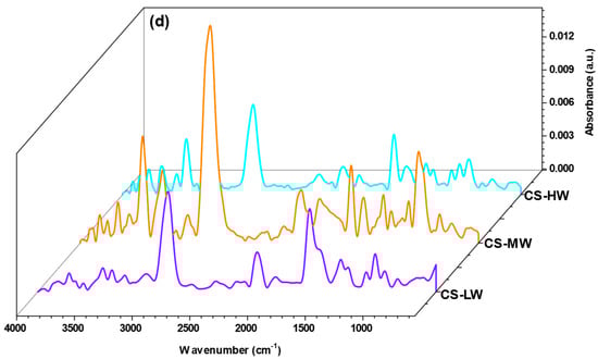 In the case of the chitosans (CS-HW, CS-MW, CS-LW), the intensity of the peaks at 1640 and 1550 cm−1 is lower than that of the commercial chitin, Ch-A and Ch-P samples. This difference can be attributed to the deacetylation reaction, during which some of the acetamide groups of chitin are converted to amino groups [,]. In the A, P and CS-HW samples, the peaks appear at approximately 1420 cm−1, originating from the bending vibrations of CH2 groups. In some sorbents, including the commercial chitin, Ch-A, Ch-P, CS-HW, CS-MW and CS-LW samples, peaks emerge at approximately 1370 cm−1, linked to the presence of deformation vibrations from CH3 groups. With the exception of sample P, the amide III band (1310 cm−1) indicates the existence of C-N groups in the sorbents [,]. These peaks are characterized by less intense absorbance. In addition, C-O-C vibrations are associated with the band between 1070 and 1000 cm−1 [,]. The occurrence of C-N and C-C groups is further evidenced by small peaks that become visible at approximately 870 cm−1 [].