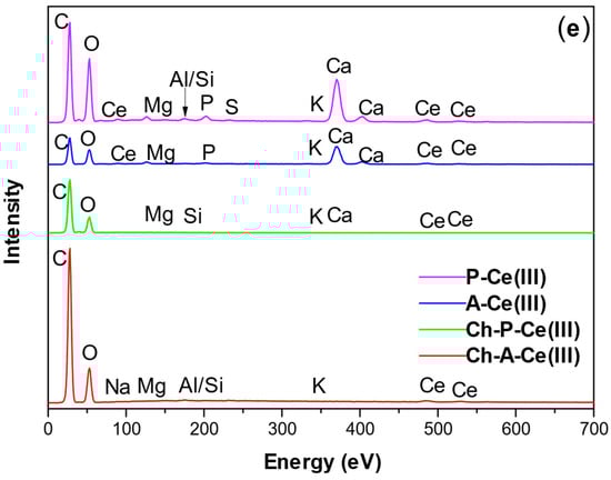 Samples of investigated materials after Ce(III) adsorption were also analyzed through energy-dispersive spectroscopy (Figure 4e). EDS spectra for commercial chitin and chitosans are presented in Figure S1 (in the Supplementary Materials). All the materials show the presence of Ce. In the samples of Ch-A and Ch-P, the occurrence of Si can be connected to silica identified by XRD in both of the samples. In A and P, a peak for Ca is clearly visible, which is not seen in the Ch-P and Ch-A samples, and which can be linked to the incidence of CaCO3 in the H. illucens exoskeleton []. This compound has also been detected by XRD analysis in the P sample. The occurrence of CaCO3 may influence the higher sorption capacity of Ce (III) ions by A and P compared to their chitin isolates. The presence of this compound may lead to carbonate ions-mediated microprecipitation process and subsequent deposition on the “rough” surface of these materials (Figure 3a,b) []. Other elements like Mg, Al, Na, Si, P, S, and K, detected in minor qualities in the samples, occur naturally in H. illucens in significant quantities []. In research publications it can be found that demineralization of the sample during chitin extraction is never complete, which is why the EDS spectra for Ch-P and Ch-A also contain mineral peak (Figure 3). For example, Hahn et al. [] also using hydrochloric acid obtained mineral removal of approximately 90% for puparia. For other types of reagents, e.g., formic acid, demineralization of 85% was achieved for puparia and 87% for flies []. However, higher efficiencies can be obtained with natural deep eutectic solvents of approximately 98% [].
