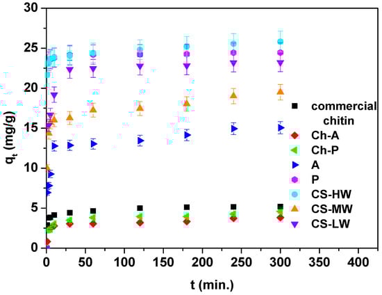 As can be seen in Figure 6, the kinetic diagram of the adsorption of Ce(III) ions consists of a fast phase at the beginning, where adsorption is rapid before it becomes constant after reaching equilibrium, indicating the exhaustion of access to sorption sites [,]. The initial stage’s quick adsorption of Ce(III) ions may have been facilitated by the larger concentration gradient and greater availability of free adsorption sites []. As is evident from Figure 6, commercial chitin, Ch-A and Ch-P reach equilibrium after 60 min. For A, P and all the chitosan samples, equilibrium is reached after 120–180 min. This is due to the fact that higher amounts of adsorbed Ce(III) ions were obtained for these materials. The qt values achieved after a time of 300 min are 5.20, 3.82, 4.58, 15.06, 24.45, 25.83, 19.49 and 23.23 mg·g−1 for commercial chitin, Ch-A and Ch-P, A, P, CS-HW, CS-MW and CS-LW, respectively. In the chitin group, the best results have been attained for commercial chitin, but the qt values observed for Ch-P are only slightly lower. These are immediately followed by sample P with a small qt difference. In general, chitins show significantly lower sorption capacities for Ce(III) ions compared to chitosans. Satisfactory results have been acquired for the ground form of H. illucens adults. This last observation should be considered positive because it opens up the possibility of the potential use of H. illucens puparia and flies without requiring their conversion into chitin.