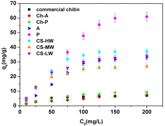 Initial concentration of solution effect for the Ce(III) ions sorption on commercial chitin, chitin obtained from H. illucens adults (Ch-A), chitin derived from H. illucens puparia (Ch-P), the ground form of H. illucens adults (A), the ground form of H. illucens puparia (P), high-molecular-weight commercial chitosan (CS-HW), medium-molecular-weight commercial chitosan (CS-MW), and low-molecular-weight commercial chitosan (CS-LW) (C0 10–200 mg·L−1, pH 3.0, t 300 min., T 25 °C, 180 rpm).