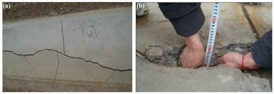 Concrete cracking morphology of one water conservancy project channel in western China. (a) Damage location; (b) maximum crack depth.