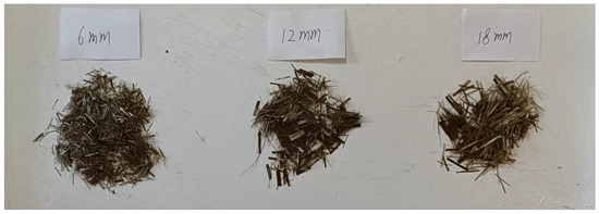 (2) Add the weighed stones, sand, and cement to the concrete mixer in turn. When no fiber is added and the fiber content is 0.1%, dry mix for 30 s (to make the basalt fiber in the concrete have good dispersibility, after many attempts, when the content is 0.2% and 0.3%, the dry mixing time is 60 s and 90 s). During the mixing process, evenly spread the basalt fiber into the mixing drum. After mixing evenly, add the accurately weighed water and water-reducing agent to the concrete mixing drum, and start the mixer again. The mixing time is 90 s. Basalt fibers of different lengths are shown in Figure 2.