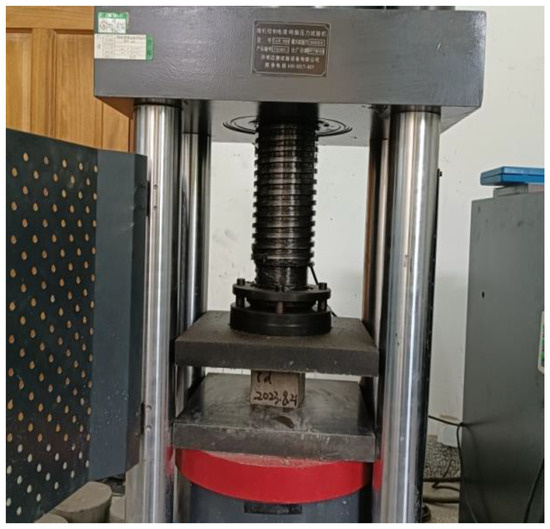 Uniaxial compression tests on basalt fiber-reinforced concrete samples under different schemes were performed. The test equipment was a 2000 kN microcomputer servo pressure testing machine produced by Jinan Maijie Testing Equipment Co., Ltd. (Jinan, China). The model of the testing machine was YAW-2000, as shown in Figure 3. The loading mode of the testing machine was stress loading mode, and the loading rate was 5 kN/s until the sample was damaged. The peak strength and final fracture mode of the sample were recorded after loading was completed.
