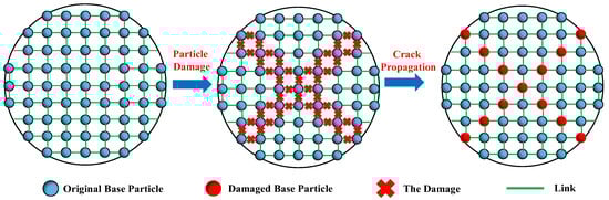 To characterize the failure of SPH particles, a failure coefficient ξ is introduced, and its default value is 1. When the stress on the SPH particle satisfies Equation (9) or Equation (10), the value of the failure coefficient ξ is set to 0, indicating that the particle is damaged. The particle failure process in SPH is shown in Figure 5. The kernel function considering particle failure characteristics is defined as I, while the traditional SPH kernel function is W. Then, the kernel function I, considering particle failure characteristics, can be expressed as: