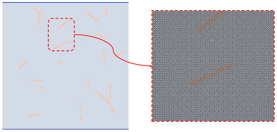 Figure 6 shows the numerical model of basalt fiber-reinforced concrete (taking scheme B2 as an example) and the schematic diagram of particle subdivision. The model size is consistent with the test size, which is 150 mm × 150 mm. The entire model is divided into 200 × 200 = 40,000 particles. The upper and lower parts of the model are loading boundaries (the blue part in Figure 5). The material parameters of the model are as follows: (1) Concrete matrix: Elastic modulus Eb = 28 GPa, tensile strength σt = 1 MPa, cohesion c = 5.95 MPa, internal friction angle φ = 40°, Poisson’s ratio μ = 0.2; (2). Basalt fiber: Elastic modulus Ef = 90 GPa, tensile strength σt = 2500 MPa, cohesion c = 5.95 MPa, internal friction angle φ = 40°, Poisson’s ratio μ = 0.2.