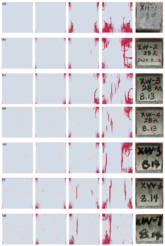 Numerical simulation results of the fracture process and the final test failure morphology of basalt fiber-reinforced concrete under different schemes. (a) Scheme A; (b) Scheme B1; (c) Scheme B2; (d) Scheme B3; (e) Scheme C1; (f) Scheme C2; (g) Scheme C3.