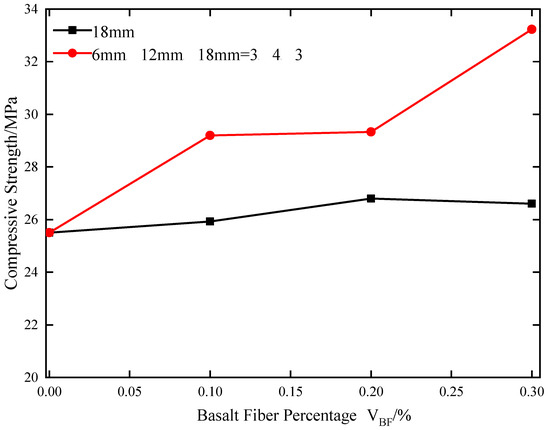(5) The strength of concrete specimens with basalt content of 0.1%, 0.2%, and 0.3% is increased by 1.69%, 5.10%, and 4.31%, respectively, compared to the strength of concrete specimens without basalt fiber. It can be seen that with the increase in single-doped basalt fiber content, the concrete strength is improved to a certain extent, but the improvement degree is not large. For concrete with mixed basalt fiber, the strength of concrete specimens with basalt content of 0.1%, 0.2%, and 0.3% is increased by 14.51%, 15.02%, and 30.31%, respectively, compared to the strength of concrete specimens without the basalt fiber. Therefore, compared to the single-doped basalt fiber process, mixed doping is easier to improve the strength of concrete.