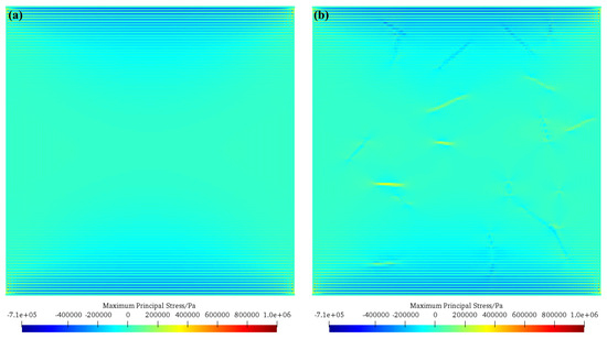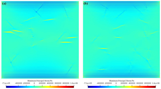 Maximum principal stress nephogram of concrete without basalt fiber (scheme A) and concrete with basalt fiber (scheme C2) before crack initiation. (a) Concrete without basalt fiber (scheme A); (b) concrete with basalt fiber (scheme C2).