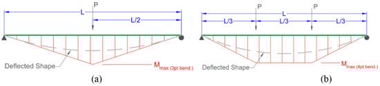 Schematic of flexural testing with deflected shapes and bending moment diagrams (a) 3-point, (b) 4-point.