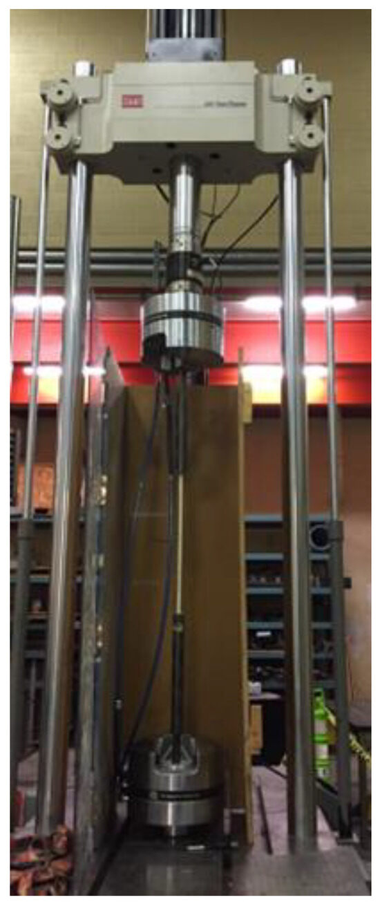 Selected direct tensile testing of bars M8, M13, and M15 was also conducted. This was based on ASTM D7205 [15]. These tests allowed for direct comparisons between correlated tensile strength obtained from bending tests and the results of direct tension tests. The largest bars we could test were M15 due to the equipment and laboratory constraints. Larger bars require higher capacity and higher length test frames, as the specimen strengths and length get larger with its diameter. The test involves casting the ends of the specimens in large DOM steel tubes, which allows for the specimens to be gripped and the bars to be pulled with uniform stress across the cross-section, ensuring tensile failure of the bars and not anchorage failure (Lochan and Polak 2022 [4]). The specimens’ length was 1320 mm for M8, 1520 mm for M13, and 1640 mm for M15. Four specimens were tested for M8 and five specimens for M13 and M15 bars. A summary of these test results is shown in Table 1. A typical specimen in the test frame (MTS 320, 500 kN capacity) is shown in Figure 2.