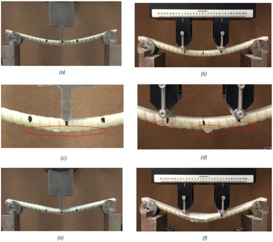 Example of the behavior of a M20 bar under 3-point and 4-point bending: (a) 2-point before failure, (b) 4-point before failure, (c) Close-up view of tensile fiber rupture in a 3-point bending, (d) Close-up view of tensile fiber rupture in a 4-point bending, (red circles show rupture zones) (e) After failure in 3-point bending, and (f) After failure in 4-point bending.