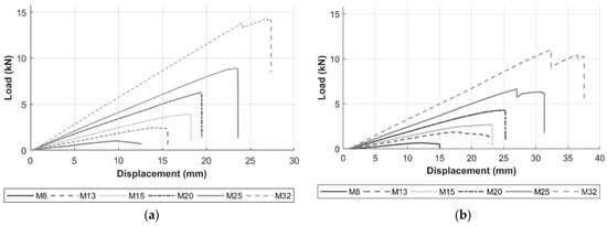 The examples of load-displacement plots, recorded during the tests, are shown in Figure 7 for all bar diameters. For the 3-point bending test, the graph shows the force (load) exerted by the loading nose versus central displacement recorded by the testing equipment. For the 4-point bending test, the results show the force versus central displacement (note the full load on the bar was 2× force). Similar patterns are noted for both types of flexure tests. All specimens show linear trends, where the response is more linear as the bar size increases. The shape of the load-displacement plot for each specimen becomes non-linear as the ultimate load is approached. Table 3 displays the ultimate loads and the corresponding deflection for each bar size from the respective flexure test.