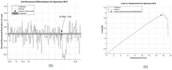 (a) Zoomed-in view of chosen cracking load from 2nd numerical derivative of load-displacement plot for M15 specimen, and (b) Example of a chosen Cracking Load on Load-Displacement Plot for M15 Specimen.