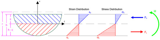 The rupture modus is determined from the cracking load using the force and moment equilibrium on the semicircular cross-sections (each cross-section was measured for exact dimensions) and the stress-strain relationships in tension and compression (Figure 9, [4]). The linear bi-modular behavior of GFRP material, which differs in tension and compression [5] was adopted in the calculations. Glass fiber reinforced polymers have different stiffnesses in tension and compression, with the tensile stiffness being higher. In the presented results, the ratio of the moduli, namely plays the role. The suggested values of this ratio, based on the literature [18,19], are between 1.2 and 1.25. Arczewska et al. [5] obtained a ratio of 1.2 and in the previous work [4] suggested using the ratio of 1.2, therefore this is used in the work presented herein. It should be noted that when a lower ratio n is used the results are more conservative (the correlated tensile strength is lower). The calculations of moduli of rupture required integration through the depth of the specimens, which were performed using a numerical layered approach with each specimen discretized by 100 layers of equal thickness [4,17].