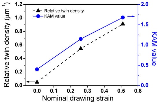 Comparison of relative twin density and kernel average misorientation values with nominal drawing strain.