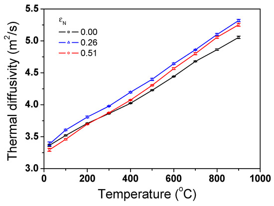 Figure 6 compares the measured α of the TWIP steel as functions of temperature and εN. Five repeated tests were performed to obtain the one measurement point and error bars were also displayed on the graph. It can be seen that the deviation of α values for the repeated measurements is small. It can be clearly observed that α increased with temperature. However, α exhibited complex behaviors depending on εN. For example, the α at an εN of 0.25 exhibited the highest value, regardless of temperature.