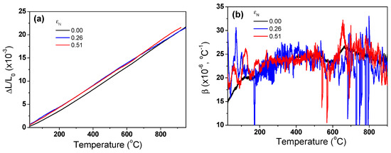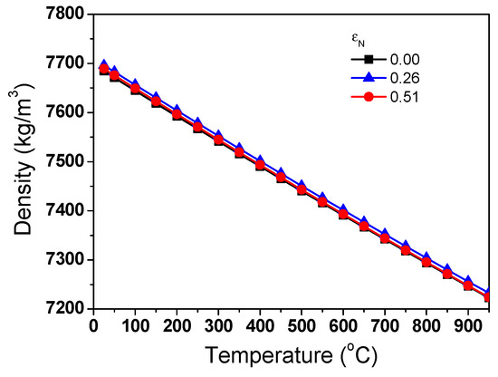 Figure 7a compares the measured ΔL/L0 of the TWIP steel as functions of temperature and εN. It can be seen that the length of the specimen expanded as the temperature increased. All the specimens showed a similar ΔL/L0, regardless of εN. The β of the TWIP steel was calculated based on Equation (3) as shown in Figure 7b. It was found that β exhibited considerable fluctuations with temperature changes due to the significantly small sampling interval. In this measurement, ΔL of the specimen was measured every 0.05 °C. This phenomenon appears to be caused by the sensitivity of the probe measuring the ΔL in the TMA equipment because this phenomenon was reduced by decreasing the sampling interval and performing a smoothing technique during the data analysis. However, in this study, most of the analyses were conducted focusing on the raw data as shown in Figure 7b to gain more insights on the thermophysical properties. Overall, the β of TWIP steel showed no specific patterns with temperature and exhibited similar values, regardless of temperature and εN. From another perspective, the overall curves showed a slight increasing trend with temperature. The average β of the TWIP steel was approximately 23.5 × 10−6 °C−1. Based on Refs. [55,56,57,58], the β of the TWIP steels was higher than those of plain carbon steels (13–15 × 10−6 °C−1) and austenitic stainless steels (18–21 × 10−6 °C−1). Figure 8 shows the measured ρ0 with εN. ρ0 exhibited similar values, regardless of εN. Figure 9 compares the calculated ρ using Equation (6). ρ decreased with temperature. This result clearly showed that the ρ of the TWIP steel was almost independent of εN.