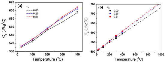 The cp of the TWIP steel increased with temperature as shown in Figure 10a, which is consistent with previous results with stainless steels with no change of crystal structure and magnetic properties [59,60]. Despite some minor fluctuations, the cp of the TWIP steel primarily increased with temperature. Therefore, cp over the temperature of 400 °C was obtained through linear fitting of the measured values as shown in Figure 10b.