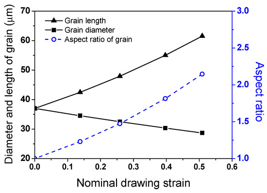Variations in calculated diameter, length, and aspect ratio of grain in the drawn wire with nominal drawing strain.