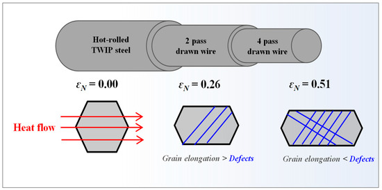 It is known that the k of metals deteriorates as the amount of plastic deformation increases because the defects, such as dislocations, induced by plastic deformation impede heat flow in the metals [63]. However, it was found that k increased in the drawn TWIP steel wire compared with the hot-rolled specimen as shown in Figure 12. And then, k decreased again as the amount of deformation increased further. In metals, the energy transport is primarily conducted due to free electrons and lattice waves (phonons) [64]. Therefore, k can be expressed as thermal conductivity depending on the movement of free electrons (ke) and thermal conductivity depending on the influence of phonons (kp) as follows: