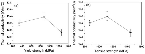 Balance of (a) thermal conductivity and yield strength and (b) thermal conductivity and tensile strength of drawn TWIP steel wire.