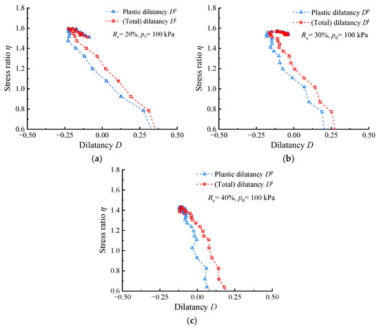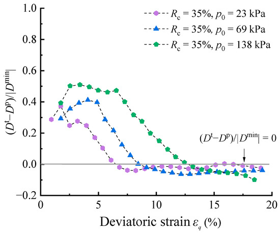 The impact of the elastic deformations in the analysis of dilatancy was further quantified using the (Dt − Dp)/|| results calculated from drained shear test data of the RCM in [37,38] with Rc = 35%. As shown in Figure 6, the experimental characteristics of the aforementioned analysis are reproducible and the errors are also at a relatively high level, which confirms the reliability of the previous conclusions.