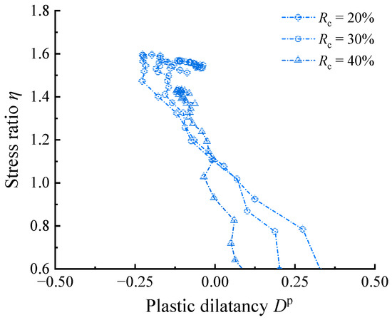 The specific effects of using η–D instead of η–Dp for dilatancy analysis need further discussion. Figure 2 shows that the η–D curves in the strength hardening (dη > 0) is generally located on the right side of the η–Dp curves (Dt > Dp, at the same η), which indicates that the high elastic deformation of the RCM makes a great contribution to the higher shear volume shrinkage and smaller shear volume expansion in the shear test. Therefore, ignoring the elastic deformation will exaggerate the resistance to shear expansion in RCM. In addition, Figure 2 shows that the phase transformation (dilatancy) stress ratio Md calibrated by η–Dt overestimates the actual value relative to that calibrated by η–Dp. This is because the existence of elastic volume contraction deformation offsets the part of the plastic volume dilatation deformation, thus the state that Dt = 0 is later than Dp = 0; since the samples are in the hardening stage, the later points have higher stress ratios. Therefore, within the common optimum range of rubber content, η–Dp is more recommended for analyzing stress–dilatancy for RCM. Figure 3 compares the η–Dp curves of RCM at different Rc values. It can be observed that as the Rc increases, the absolute value of Dp decreases, indicating that both plastic contraction and dilation are diminishing.