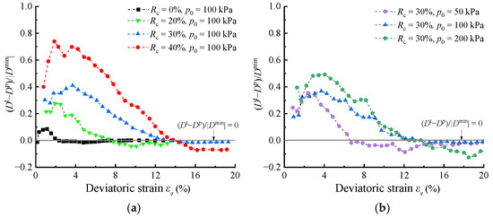 The previous analysis provided a general overview. To further quantify the estimated error arising from replacing Dp with Dt in shear, the modified relative error: (Dt − Dp)/|| versus εq under varying p0 and Rc conditions are further analyzed. Here, Dp was replaced with || to prevent the denominator from being zero. Overall, Figure 4a,b depict that (Dt − Dp)/|| values increase with the increase in Rc and p0, and the influence of Rc is much more significant. Notably, when the curves in Figure 4 intersect the x-axis, samples reach their peak stress state, characterized by dq = dp = 0. According to Equation (3), Dt = Dp and (Dt − Dp)/|| = 0 can be derived when dq = dp = 0. Using the peak stress state as a reference point, the region above the x-axis corresponds to the stress hardening, while the region under the x-axis corresponds to the stress softening. During the stress hardening, the modified relative error of all tests first increases and then decreases to 0 at the peak stress state. During stress softening, the modified relative error of host sand (Rc = 0) is almost zero. However, the error of RCM in stress softening gradually increases with increasing p0 and Rc, but it is still much smaller than that in stress hardening. The maximum (Dt − Dp)/|| value in RCM with Rc = 40% approaches eight times greater than that with Rc = 0%.