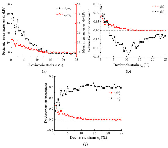 The relationships of stresses and strain increments with deviatoric strain: (a) dq and dp versus εq; (b) d and d versus εq; (c) d and d versus εq (taking the test condition with Rc = 30% and p0 = 100 kPa in [36] as an example).
