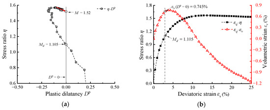 As previously mentioned, m is calculated using Md and ψd at the phase transformation state. For highly elastic RBM, previous studies have used various descriptions to define this state; e.g., the state where the Dt = dεv/dεq = 0 [36], the state where the εv reaches its minimum value [16,38,39]. In summary, these descriptions collectively indicate the location of maximum total compressive volumetric deformation (Dt = 0), which corresponds to the densest state under shear. However, the previous section of this paper has shown that using Dt = 0 will delay the phase transformation state, and overestimate Md. Therefore, a modified calibration method for m is proposed. As shown in Figure 7a, a more precise phase transformation stress Md is determined based on the η–Dp curve. Then, the deviatoric strain at the phase transformation state εq (η = Md) of the materials is determined according to the εq–η curve, as shown in Figure 7b. Subsequently, εv (η = Md) can be determined based on the εq–εv curve for converting the void ratio e (η = Md) and calculating the ψd. Finally, substituting Md and ψd determined by new method into Equation (10) yields a more precise value of m. The critical state ratio M needed for calculation in Equation (10) is determined by the extrapolation method introduced in [16,56,57]. Specifically, as indicated by the red arrow in Figure 7a, this involves linearly fitting the data near the end of the test and extrapolating it to the point where Dp = 0.