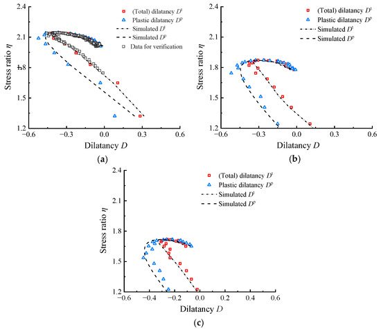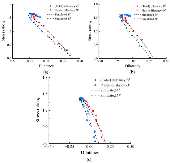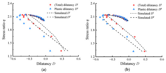 Figure 10 compares the simulation results obtained using the dilatancy parameters calibrated by the proposed method in Table 2 with those obtained using parameters calibrated by the original method. The comparison uses the test conditions with Rc = 35% and p0 = 23 kPa from [37,38] as an example, where D0 = 2.4 and m = 3.1 were determined by original method and extrapolated M. In Figure 10a, the simulated η–Dt and η–Dp curves using the parameters calibrated in this paper both exhibit good agreement with tested curves. In Figure 10b, due to the neglect of elastic deformation during parameter calibration, the simulated η–Dp matches the measured η–Dt, while the simulated η–Dt overestimates the overall contraction observed in the measured data.