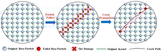 It can be found from the control Equations (3) and (4) in SPH that the derivative of the kernel function controls the parameter transfer between SPH particles. Therefore, in this section, a parameter к that can characterize whether a particle fails is introduced. When the particle is not damaged, set к = 1. When the particle reaches the failure criterion (5) or (6), set к = 0, indicating that the particle is damaged. The numerical processing flow of the particle failure processes under the SPH framework is shown in Figure 1. Multiplying the fracture marker к by the traditional smooth kernel function W can obtain the expression of the improved kernel function I considering particle failure:
