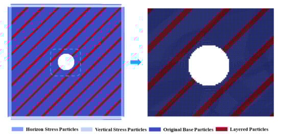 Figure 3 shows the size and particle subdivision of the tunnel excavation model with bedding planes. Among them, the model size is taken to be more than five times the tunnel diameter, which is 100 m × 100 m. A circular excavation body with a radius of 6.2 m is set in the middle of the model. Corresponding confining pressure is applied to the model boundary. The entire model is divided into 200 × 200 = 40,000 particles. The numerical stability of the method has been proved by previous studies. The parameters of the model are as follows []: for the rock mass matrix, the elastic modulus E = 50.59 Mpa, the tensile strength σt = 11.523 MPa, and the Poisson′s ratio μ = 0.14; the cohesion c = 23.95 MPa, and the internal friction angle φ = 40°; for the bedding structure, the elastic modulus E = 10 Mpa, the tensile strength σt = 7.5 MPa, and the Poisson′s ratio μ = 0.14; the cohesion c = 18.895 MPa, and the internal friction angle φ = 40°. The model gradually applies confining pressure within the initial 7000 steps. The tunnel excavation operation is performed at 7000 steps, and the calculation continues until 10,000 steps.
