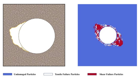 To verify the rationality of the numerical simulation in this paper, Figure 4 and Figure 5 show the excavation damage process of the tunnel model without bedding structure and the comparison with the previous engineering damage and failure. Among them, the white marked particles represent tensile failure particles, and the red marked particles represent shear failure particles. As can be seen from the figure, with the tunnel excavation operation, an excavation damage area appears around the tunnel. Among them, tensile and shear failure particles mainly appear in the two o′clock and eight o′clock directions around the tunnel, indicating that tensile–shear composite failure mainly occurs here. In the 4 o′clock and 10 o′clock directions around the tunnel, shear failure particles mainly appear, indicating that shear failure mainly occurs here. And as the loading steps continue, the damage area in the 4 o′clock and 10 o′clock directions around the tunnel becomes larger, indicating that excavation failure occurs here. It can be seen from Figure 5 that the excavation damage morphology of the tunnel model without bedding structure in this paper is highly consistent with the excavation damage range of the previous Jinping tunnel [], which verifies the rationality of the numerical simulation in this paper.